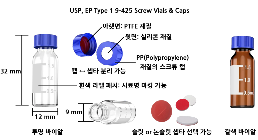 - 9-425 규격의 바이알로써 주요 HPLC 및 GC 오토샘플러(Autosampler) 완벽 호환